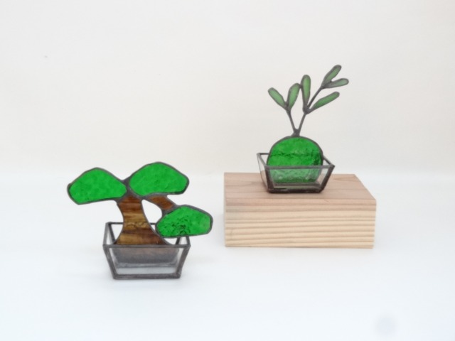 ステンドグラスの技法を使って造られた手のひらサイズの「BONSAI」です。 作品名は「BONSAI」。 現在、イタリアで製作する作者が日本を振り返り産まれた作品2種類をご紹介します。MADE IN ITALYの逆輸入作品です。 卓上にちょっとしたグリーンを添えたい時や、特別な贈り物としても最適です。新生活のお祝いはもちろん、大切な方への感謝の気持ちを込めた贈り物にもぴったりです。 <松> クラシカルな松の盆栽を表現しました。幹に使われたガラスは松のゴツゴツした肌感を表現しています。 サイズ : 幅約9cm x 奥行き約5cm x 高さ約7cm <オリーブ> 苔玉の上にオリーブを活けました。イタリアのオリーブの木の下で産まれた作品です。 サイズ : 幅約7cm x 奥行き約5cm x 高さ約9cm 手作りの為個体差があります。ご理解いただいた上でご購入ください。